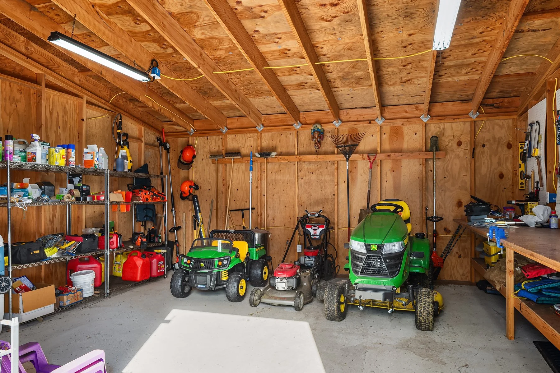 Step into the versatile workshop. This flexible space invites you to bring your projects to life, offering ample room to build and store tools. We’re even throwing in a riding lawnmower to get things started.